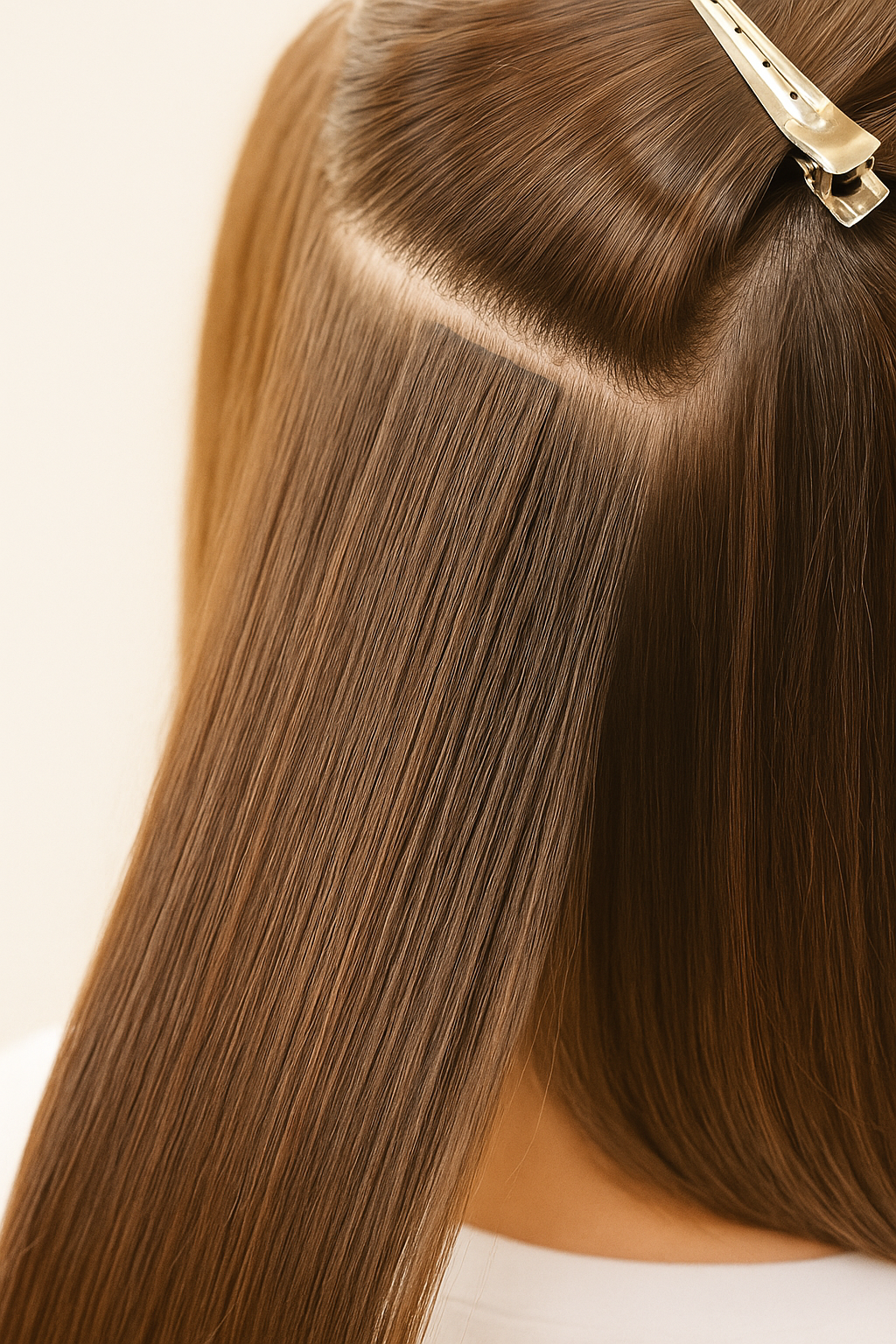 • Heat styling: Heat protectant; tools ≤ 350°F / 175°C. Don’t run irons directly over the tape area.